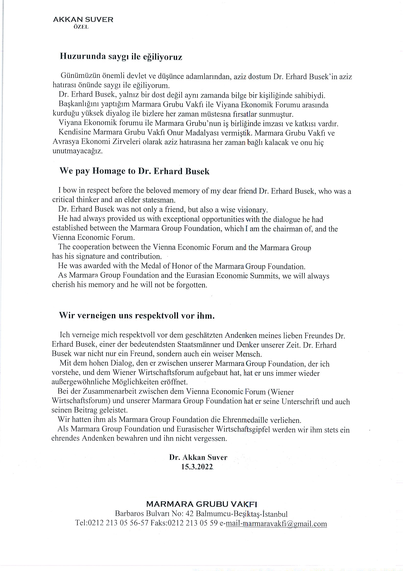 Condolence Book opened in Vienna for the Former Chancellor of Austria, Dr. Erhard Busek, who passed away on March 14, 2022. Akkan Suver's condolence message was delivered. The Condolence Book opened in Vienna in the memory of Austrian Chancellor Dr. Erhard Busek ( 1991 - 1995 ) who was the architect of the formation of the cooperation between the Marmara Group Foundation and the Vienna Economic Forum. President of the Turkish Cultural Community in Austria, Birol Kılıç presented the Message of Respect from Marmara Group Foundation General President Dr. Akkan Suver in three languages.