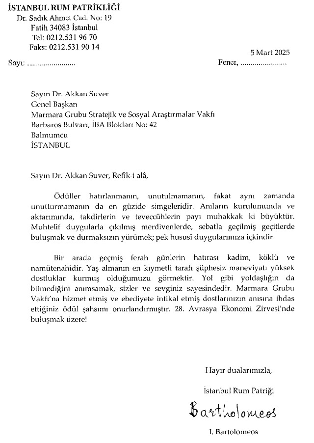 We present below the letter written by Patriarch Bartholomeos to Dr. Akkan Suver for the Award:
