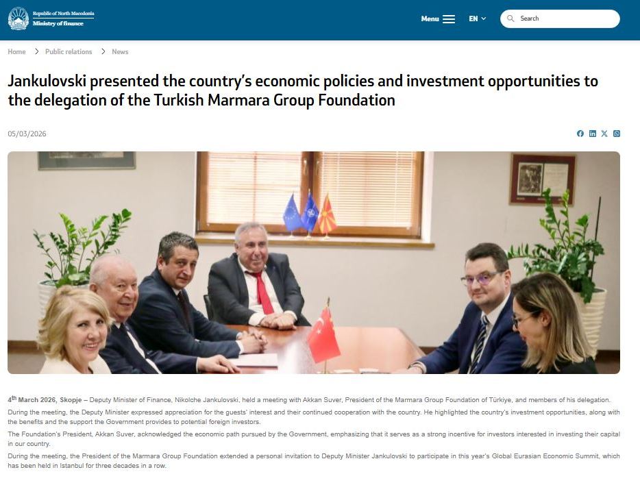 Nikolche Jankulovski, Deputy Minister of Finance of North Macedonia, received the delegation of the Marmara Group Foundation.