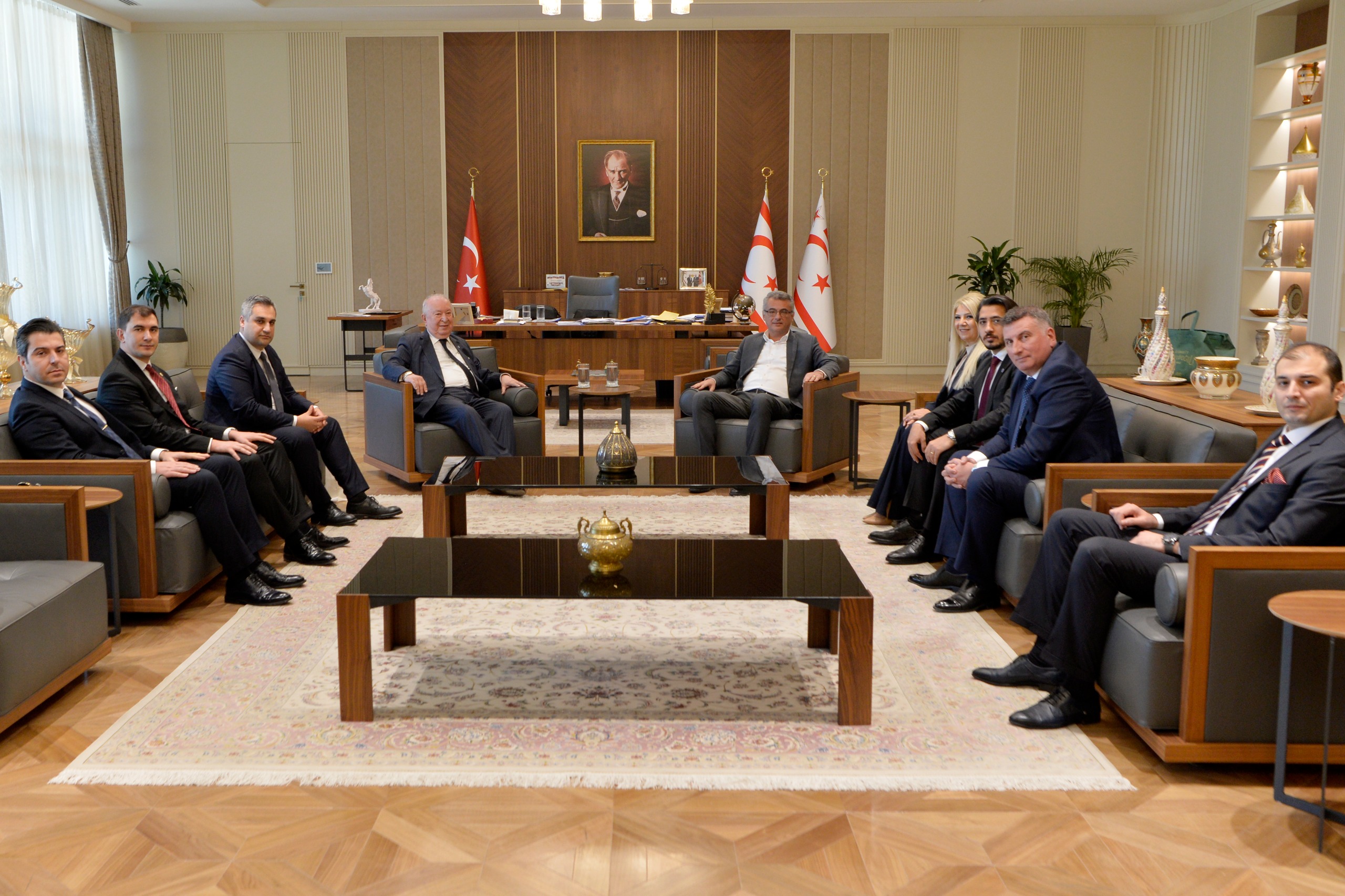 President of the Turkish Republic of Northern Cyprus, H.E. Tufan Erhürman, received a delegation of the Marmara Group Foundation—comprising Dr. Akkan Suver, Mahmut Saklı, Ece Şahin, Oğuzhan Ceylan, Mustafa Ergin, Zafer Yılmaz, and Hakan Özdemir—at the Presidential Palace in Nicosia.