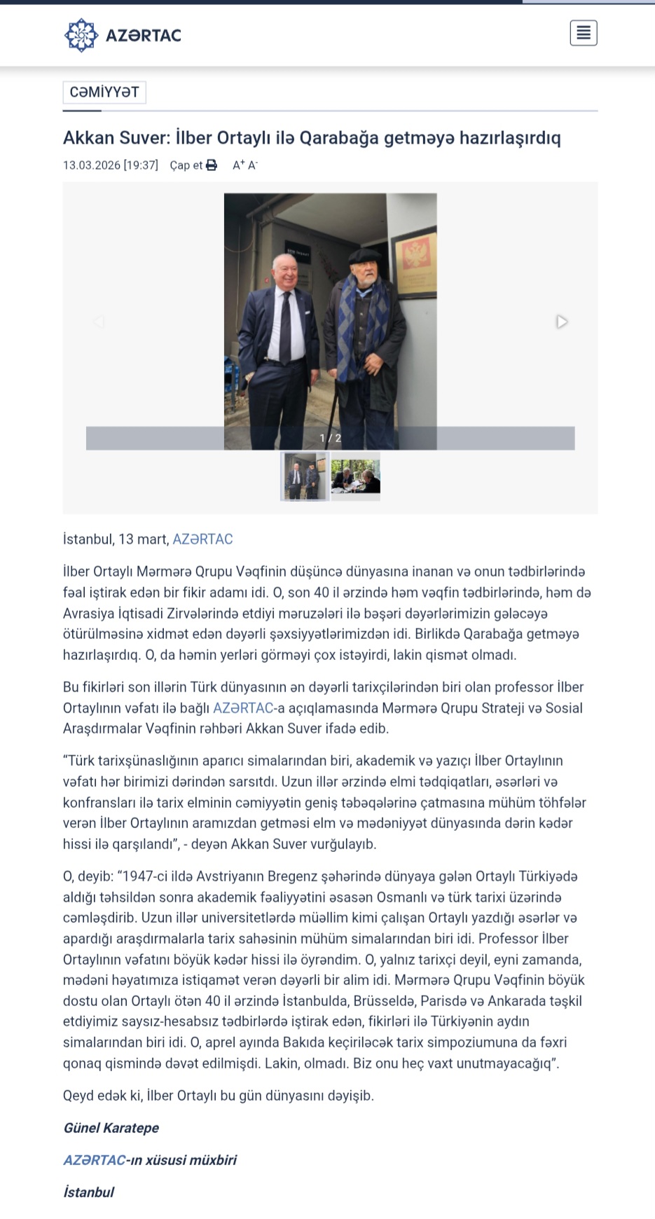 "Türk tarihçiliğinin müstesna isimlerinden Prof. Dr. İlber Ortaylı’nın vefatını büyük bir üzüntüyle öğrenmiş bulunuyorum. İlber Ortaylı, yalnız bir tarihçi değil; aynı zamanda kültür hayatımıza yön veren kıymetli bir ilim adamıydı. Marmara Grubu Vakfı’nın büyük dostu, geride bıraktığımız 40 yıl içinde İstanbul’da, Brüksel’de, Paris’te, Ankara’da gerçekleştirdiğimiz sayısız etkinliğimizde yer alan, düşünceleriyle Türkiye’nin aydınlık yüzü olan İlber Ortaylı’yı unutmayacağız.