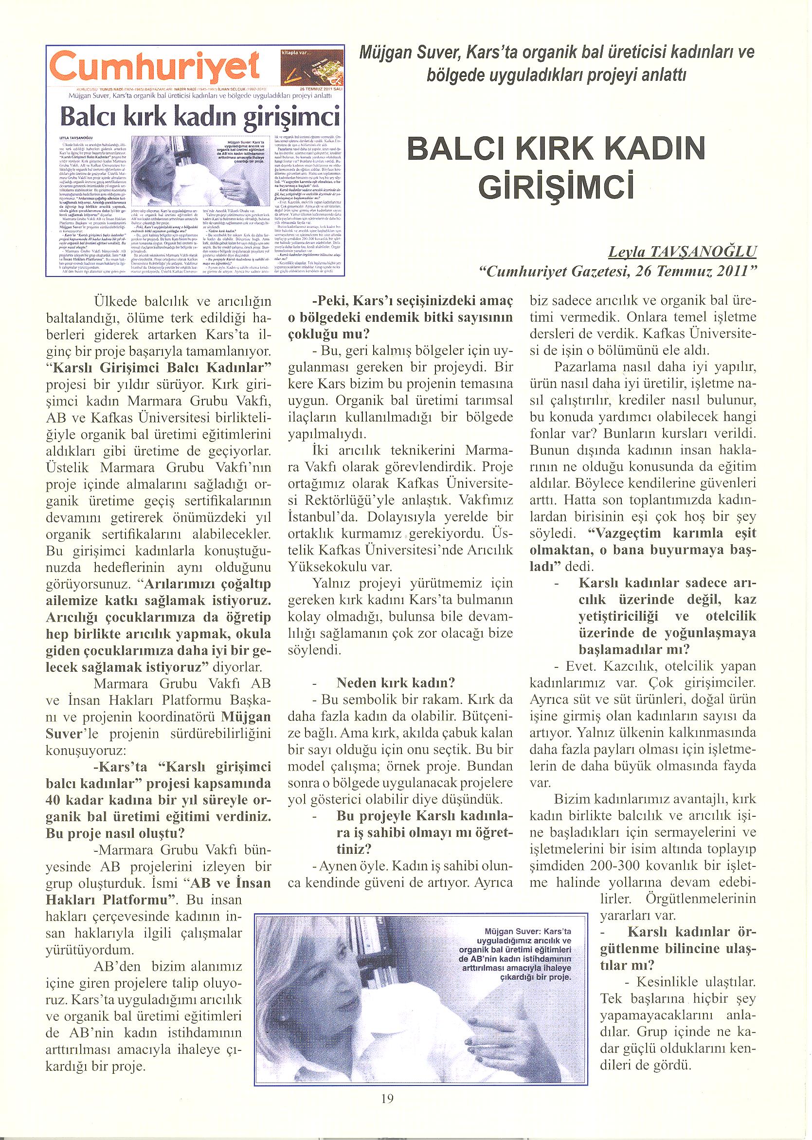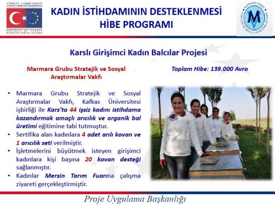 Marmara Grubu Vakfı, kadınların iş gücü piyasalarına katılımını sağlamak ve kadın istihdamına yönelik model oluşturmak amacı ile 28 Temmuz 2010’da başlayıp 28 Temmuz 2011’de tamamladığı “Karslı girişimci kadın balcılar hibe programı” projesi kapsamında 40 kadına yönelik;