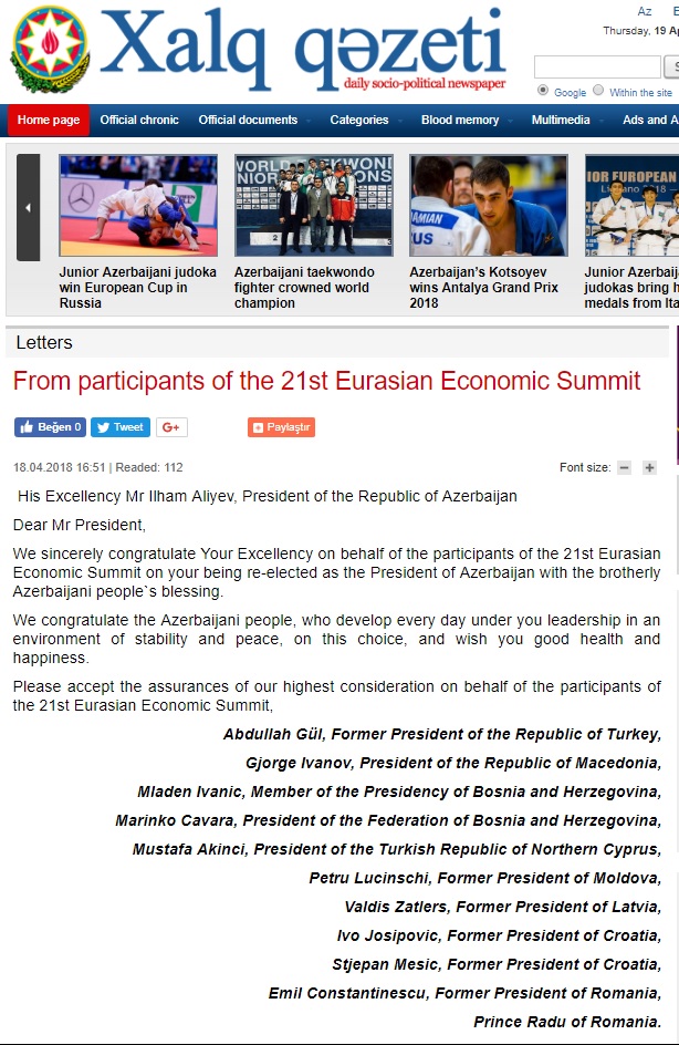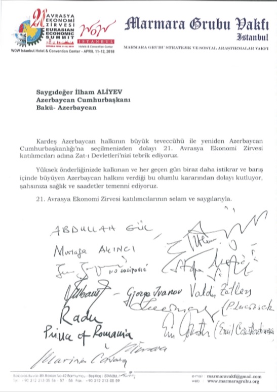 11 ve 12 Nisan 2018 günleri, 41 ülkenin katılımıyla gerçekleştirilen katılan Türkiye Başbakanı Binali Yıldırım, Başbakan Yardımcısı Mehmet Şimşek, Ekonomi Bakanı Nihat Zeybekçi, önceki Başbakan Yardımcısı Milletvekili Tuğrul Türkeş, İstanbul Valisi Vasip Şahin ve İstanbul Büyükşehir Belediye Başkanı Mevlut Uysal’ın da aralarında bulunduğu 21. Avrasya Ekonomi Zirvesi katılımcıları oy birliğiyle aldıkları bir kararla Azerbaycan Cumhurbaşkanlığına yeniden seçilen İlham Aliyev’e bir kutlama mesajı gönderdiler.