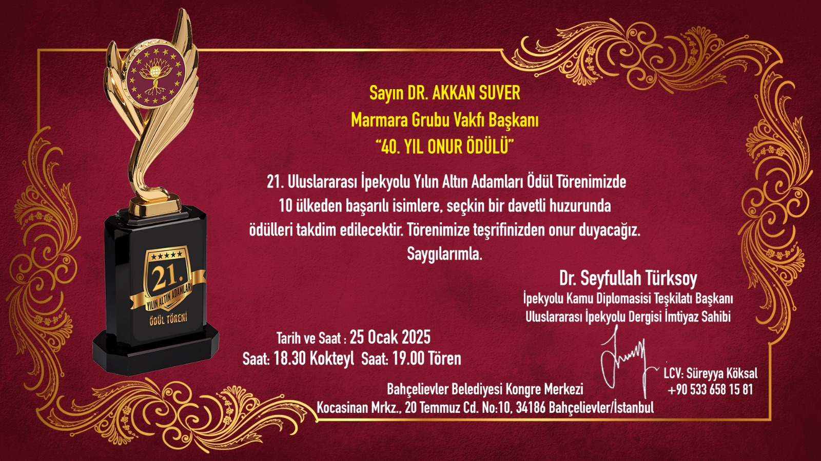 International Silk Road Magazine deemed Dr. Akkan Suver, President of the Marmara Group Foundation, worthy of the HONOR AWARD for the 40th anniversary of the Marmara Group Foundation, of which he is the President.
