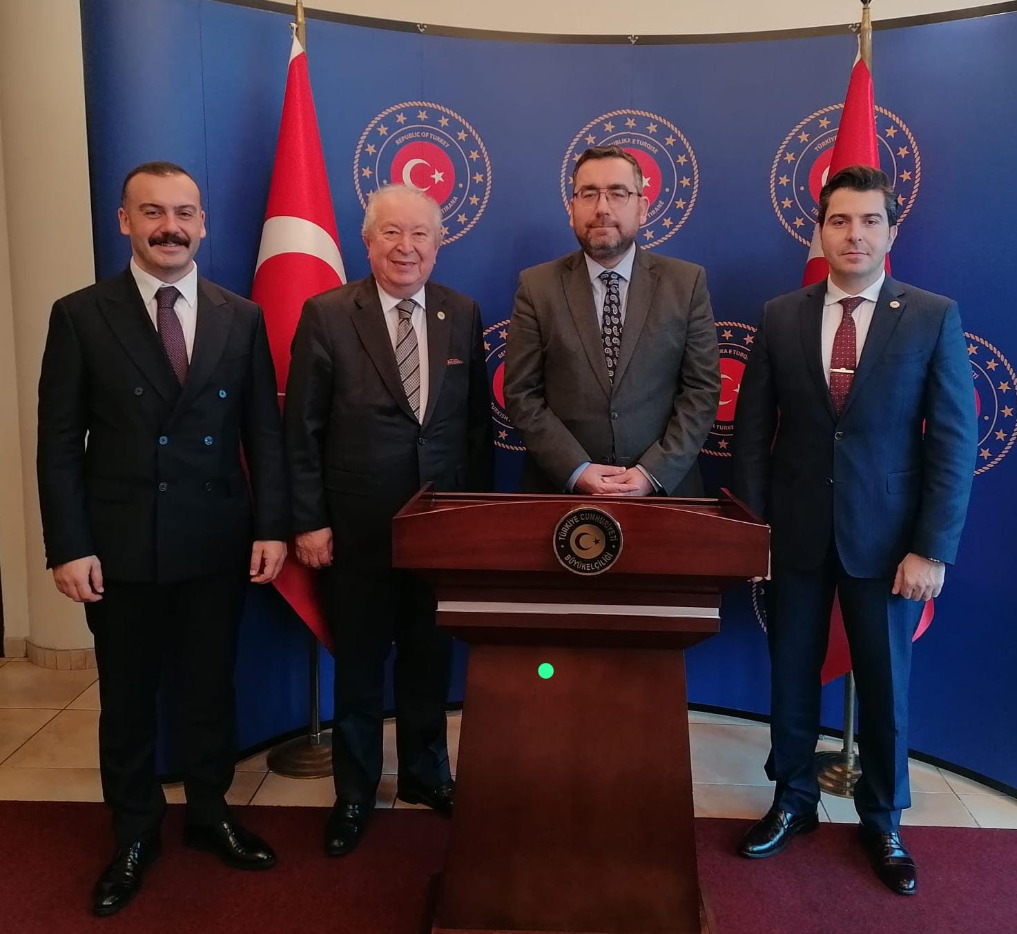 The delegation of the Marmara Group Foundation, consisting of Dr Akkan Suver, Serhat Tabanca and Mustafa Ergin within the framework of the 26th Eurasian Economic Summit promotional visits in Tirana, visited the Ambassador of the Republic of Türkiye to Tiran Tayyar Kağan Atay in his office. During the visit, members of the Delegation presented information to Ambassador Tayyar Kağan Atay.
