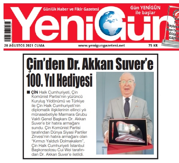 Çin Halk Cumhuriyeti, Çin Komünist Partisi’nin yüzüncü Kuruluş Yıldönümü ve Türkiye ile Çin Halk Cumhuriyeti’nin diplomatik ilişkilerinin ellinci yılı münasebetiyle Marmara Grubu Vakfı Genel Başkanı Dr. Akkan Suver’e bir hatıra armağanı sundu.