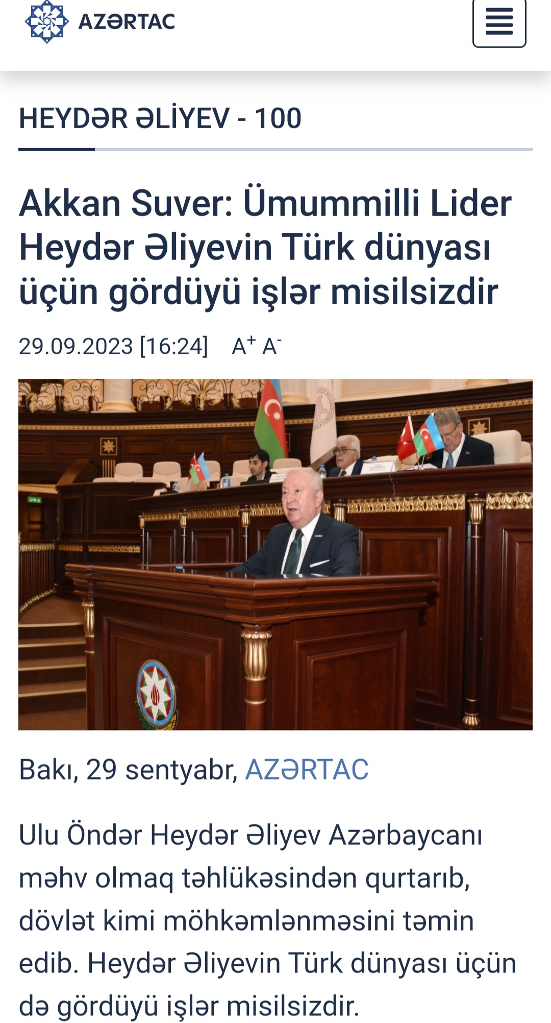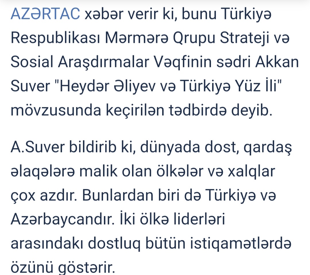 Marmara Grubu Vakfı Genel Başkanı Dr. Akkan Suver, Haydar Aliyev'in 100. Doğum Yılı ve Türkiye Cumhuriyeti'nin 100. Şeref Yaşı münasebetiyle Bakü Azerbaycan Milli İlimler Akademisi'nde konuştu İstanbul Milletvekili Şamil Ayrım da yaptığı konuşmada Haydar Aliyev ile dostluğunu anlattı.