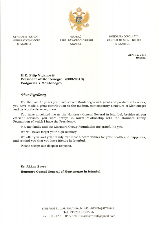 Görev süresi sona eren Karadağ Cumhurbaşkanı Filip Vujanovic'e bir mektup gönderen Dr. Akkan Suver, geride bırakılan on sene içinde ortaya koyduğu müstesna hizmetlere ve Marmara Grubu Vakfı'nın çalışmalarına gösterdiği ilgiye teşekkür etti. Dr. Akkan Suver mektubunda Cumhurbaşkanı Filip Vujanovic'e Marmara Grubu Vakfı'nın duyduğu şükran duygularını da belirtti.