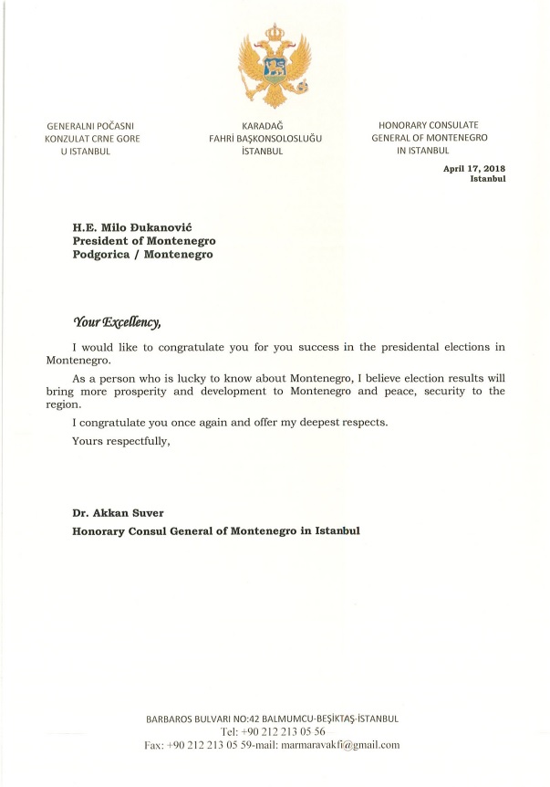 Karadağ Cumhurbaşkanı Filip Vujanovic'in görev süresinin sona ermesi münasebetiyle yapılan seçimleri ilk turda kazanan Cumhurbaşkanı Milo Djukanovic'i tebrik eden Dr. Akkan Suver başarı dileklerini sundu. Balkanların istikrarlı bir barış ülkesi olan Karadağ'da Cumhurbaşkanlığı seçimleri beş yılda bir yapılmaktadır.