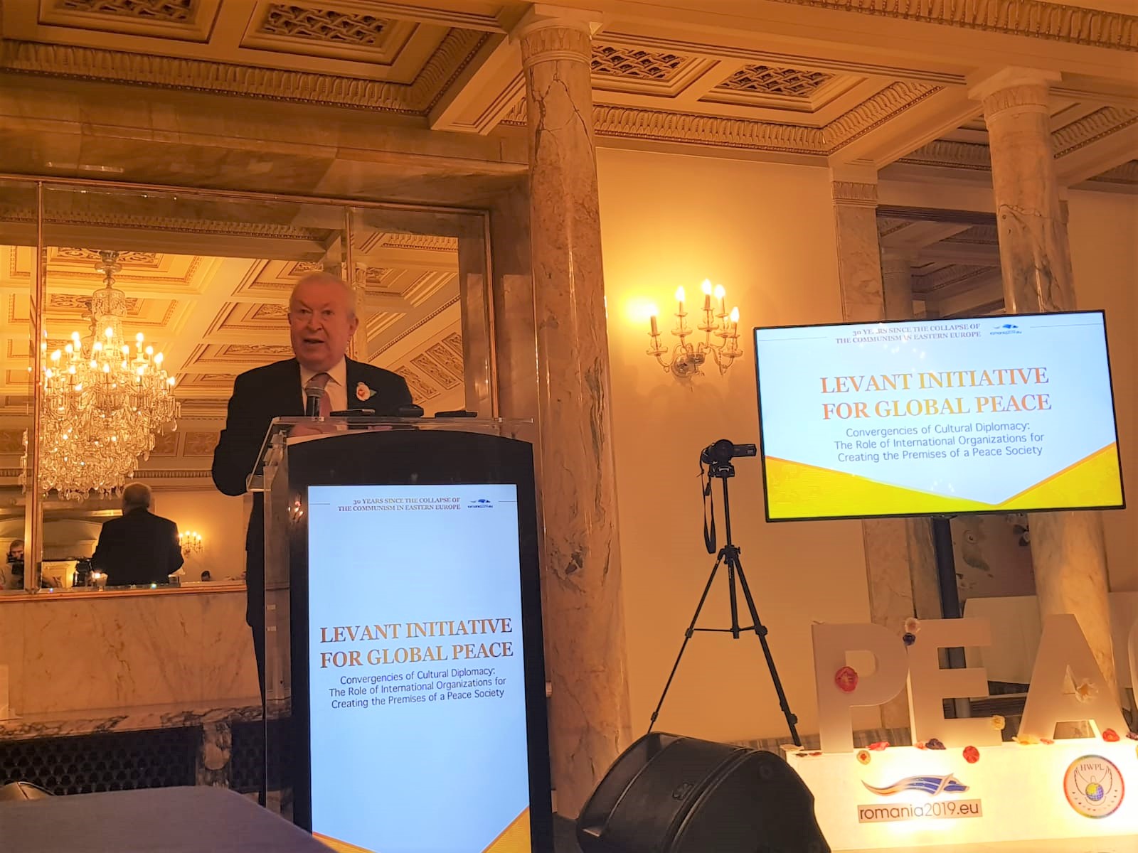 Dr. Akkan Suver, Romanya'nın başkenti Bükreş'te Kraliyet Sarayı'nda düzenlenen Küresel Barış için Levant Enstitüsü toplantısında konuştu. Konuşmasında Dr. Akkan Suver Levantenlerin küreselleşmeye ve barışa yaptıkları katkıyı anlattı.