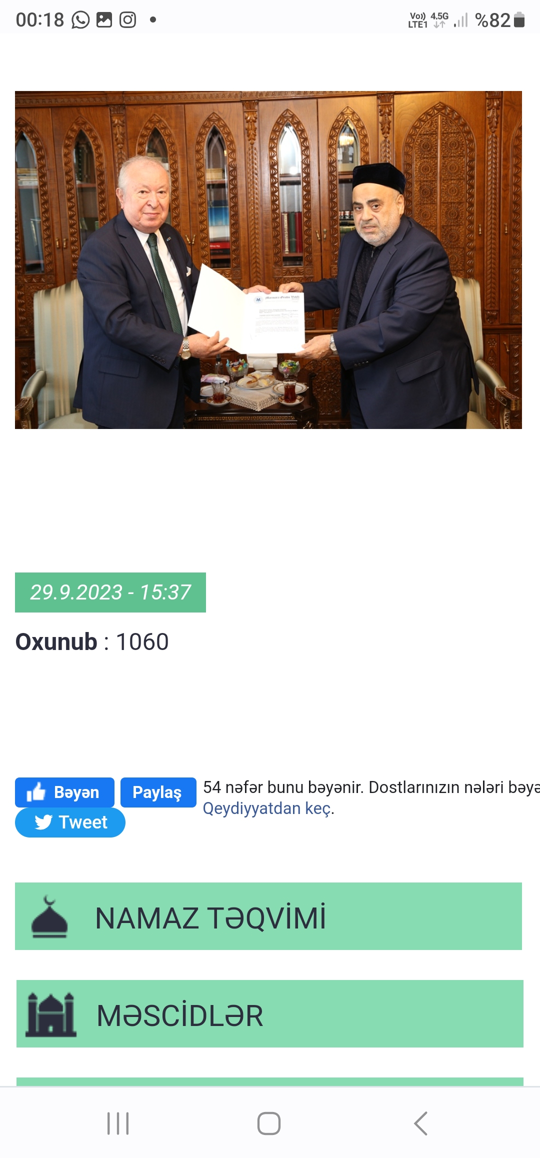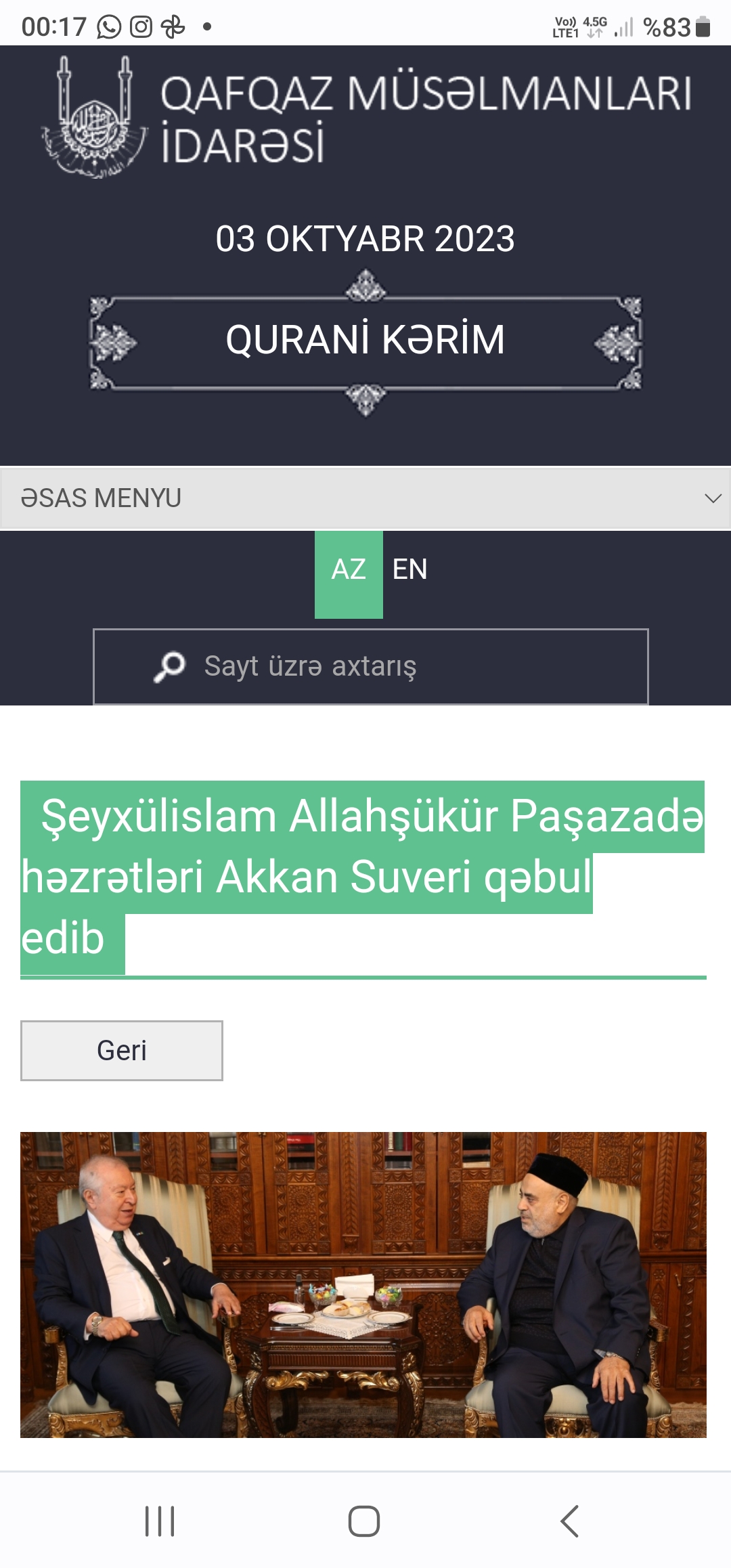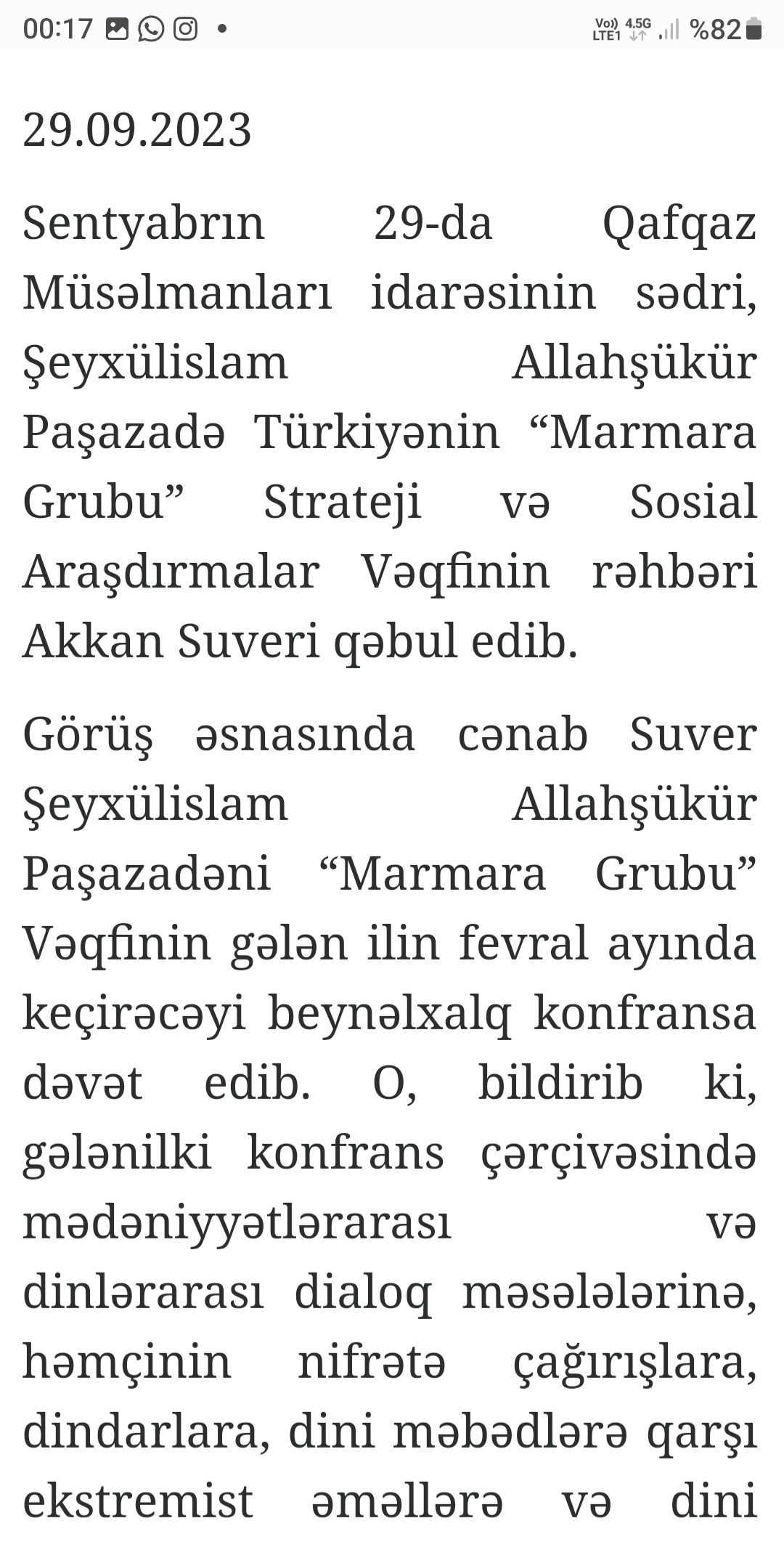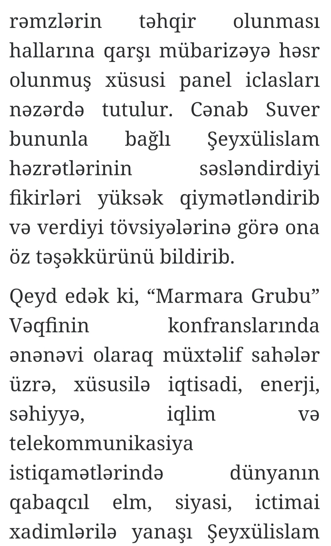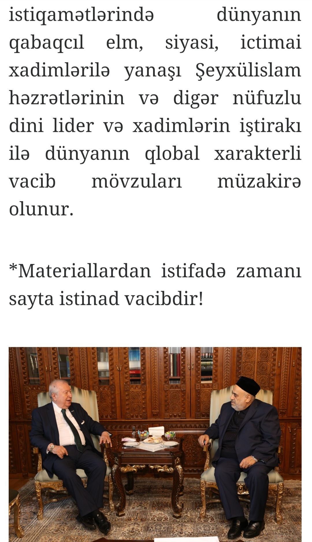 Bakü’de bulunan Marmara Grubu Vakfı Genel Başkanı Dr. Akkan Suver, Azerbaycan ve Kafkasya Müslümanları Şeyh-ül İslamı Allahşükür Paşazade'yi makamında ziyaret etti.