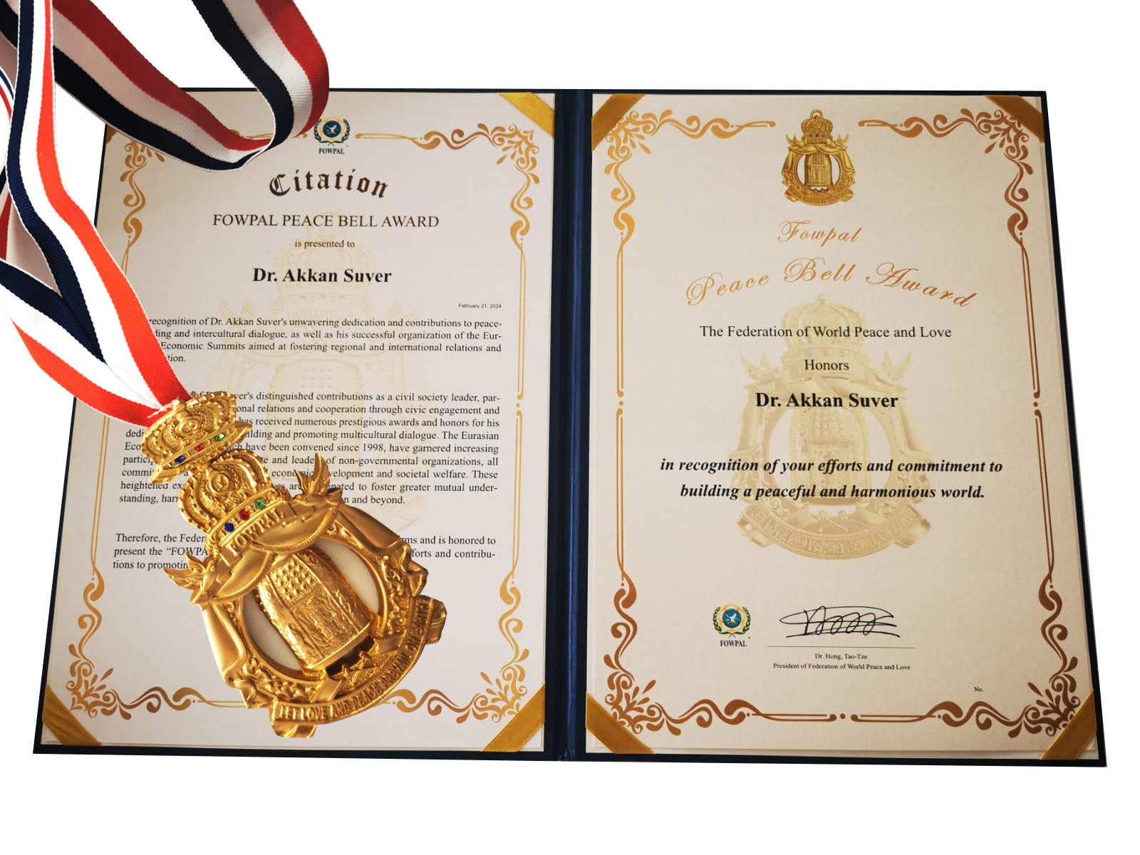 Marmara Grubu Vakfı Genel Başkanı Dr. Akkan Suver'e Merkezi ABD'de bulunan FOWPAL (Sevgi ve Barış Federasyonu) Başkanı Dr. Hong Tao Tze tarafından Sevgi ve Barış Madalyası verildi.