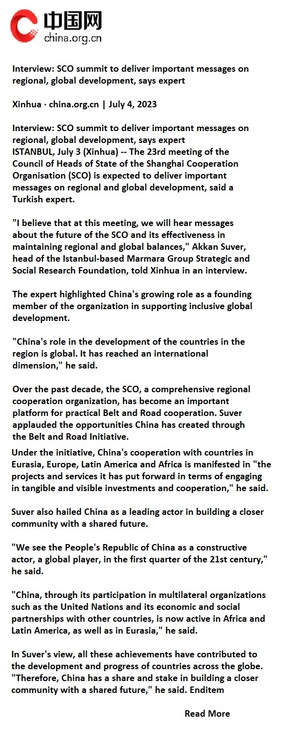 Marmara Grubu Vakfı Genel Başkanı Dr. Akkan Suver, Yeni Delhi'de toplanan Şangay Ekonomik İşbirliği Teşkilatı çalışmaları öncesinde Çin Xinhua Ajansı'na bir demeç verdi.