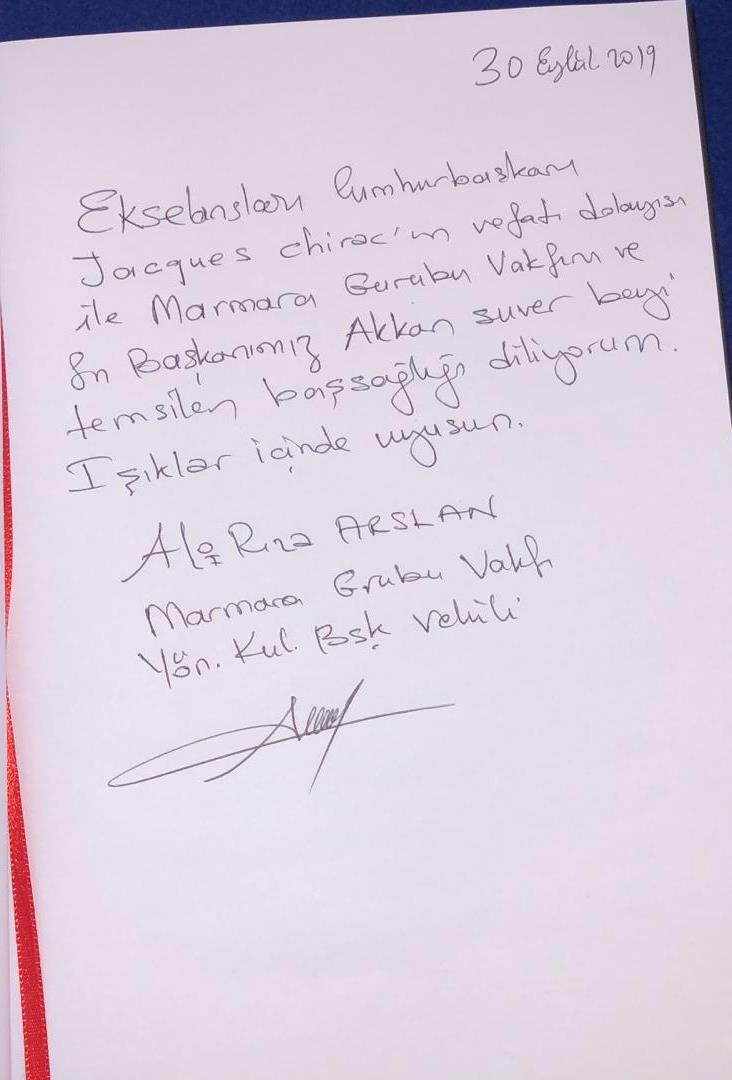 Fransa'nın eski Cumhurbaşkanlarından Jacques Chirac'ın ebediyete intikali münasebetiyle İstanbul’da bulunan Fransa Başkonsolosluğunda bir Saygı Toplantısı düzenlendi. İstanbul’da bulunan mülki erkanın ve diplomatik misyon şeflerinin hazır bulunduğu Saygı Törenine Türk sivil toplumunu temsilen Marmara Grubu Vakfı katıldı. Anı Defterini imzalayan Marmara Grubu Vakfı Genel Başkan Yardımcısı Ali Rıza Arslan, (- Yalnız bir Büyük Devlet Adamını değil Türkiye'nin bir dostunu da kaybetmiş bulunuyoruz) dedi.