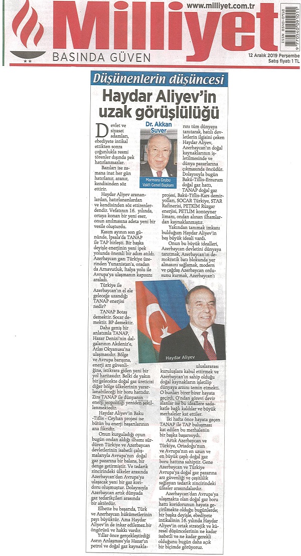 Haydar Aliyev'in ebediyete intikali ile ilgili Dr. Akkan Suver 12 Aralık 2019 günü Milliyet Gazetesi’nde bir makale de kaleme aldı.