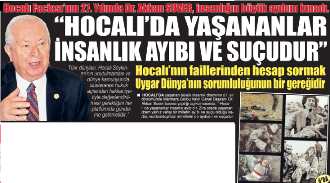 Hocalı'da yaşanan büyük insanlık dramının 27. yıl dönümünde Marmara Grubu Vakfı Genel Başkanı Dr. Akkan Suver basına yaptığı açıklamasında; "-Hocalı'da yaşananlar insanlık ayıbıdır. Zira orada yaşanan dram yalnız vahşi bir milletin ayıbı ve suçu olduğu kadar, vurdumduymaz milletlerin de ayıbıdır ve suçudur. Bu büyük katliama ve vahşete sessiz ve duyarsız kalmak en azından bu insanlık suçuna ortak olmaktır. Dolayısıyla Hocalı'nın faillerinden hesap sormak, uygar dünyanın sorumluluğunun bir gereğidir."