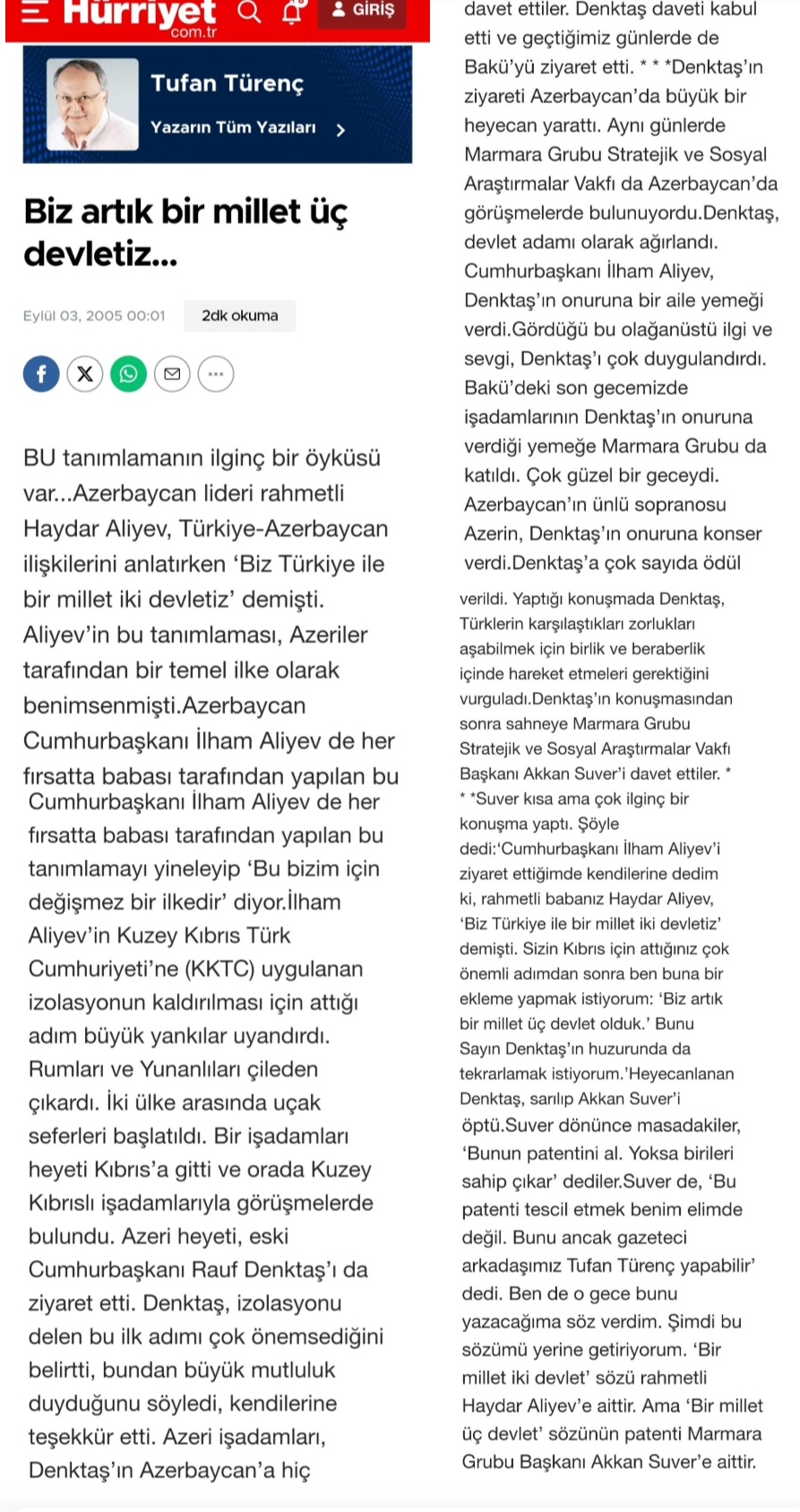 O günden ebediyete intikal ettiği güne kadar sayısız defa Marmara Grubu Vakfı'nın toplantılarında yer alan Rauf Denktaş'ın görevinden ayrıldıktan sonra Azerbaycan'a ziyaretini de gerçekleştirmenin de onurunu taşımaktayız. O bağımsız ikinci bir Türk Devleti bırakmış bir devlet adanı olarak tarihe mal olmuştur.