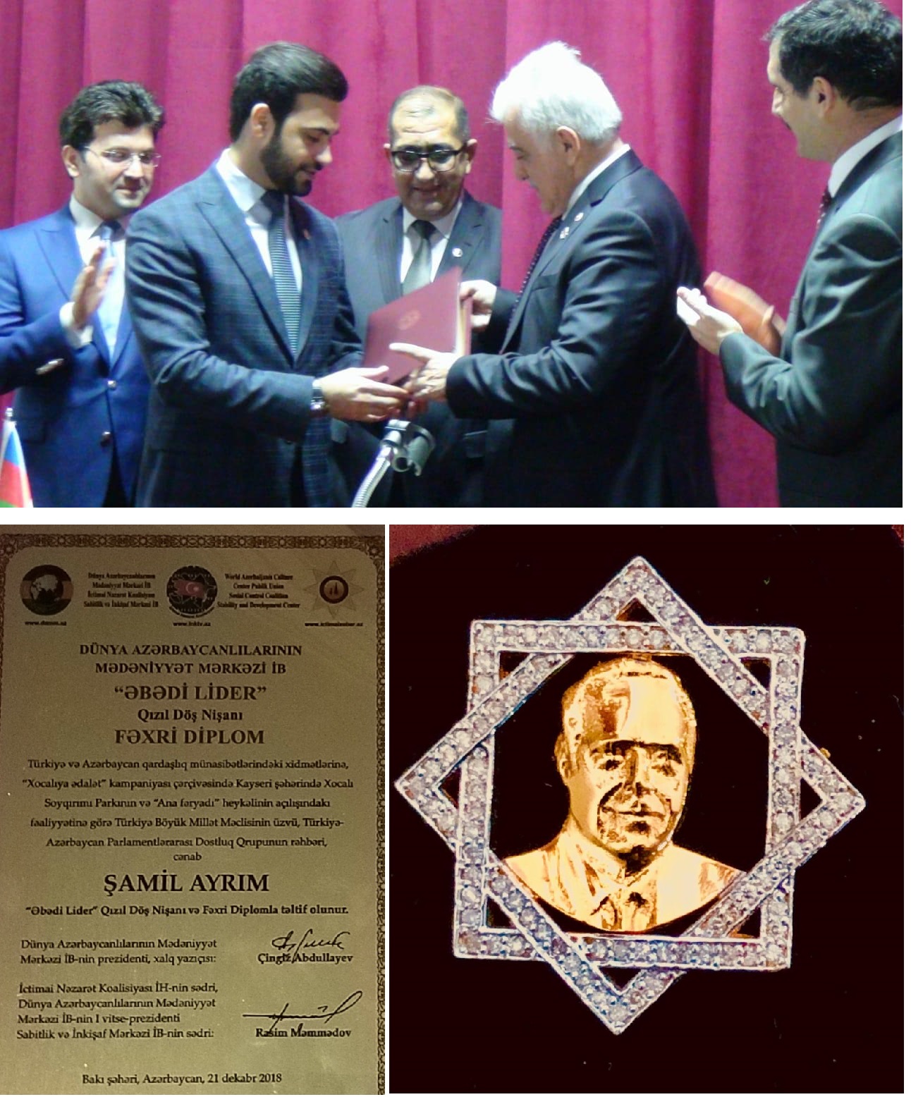 Bakü’de Dünya Azerbaycanlıları Medeniyet Merkezinde Gerçekleştirilen Tören de Ak Parti İstanbul Milletvekili Türkiye - Azerbaycan Parlamentolar Arası Dostluk Grubu Başkanı ve Marmara Grubu Vakfı Genel Başkan Yardımcısı Şamil Ayrım Dünya Azerbaycanlıları Medeniyet Merkezi tarafından ‘’Ebedi Lider Kızıl Döş Nişanı ve Fahri Diploma” ile ödüllendirildi.