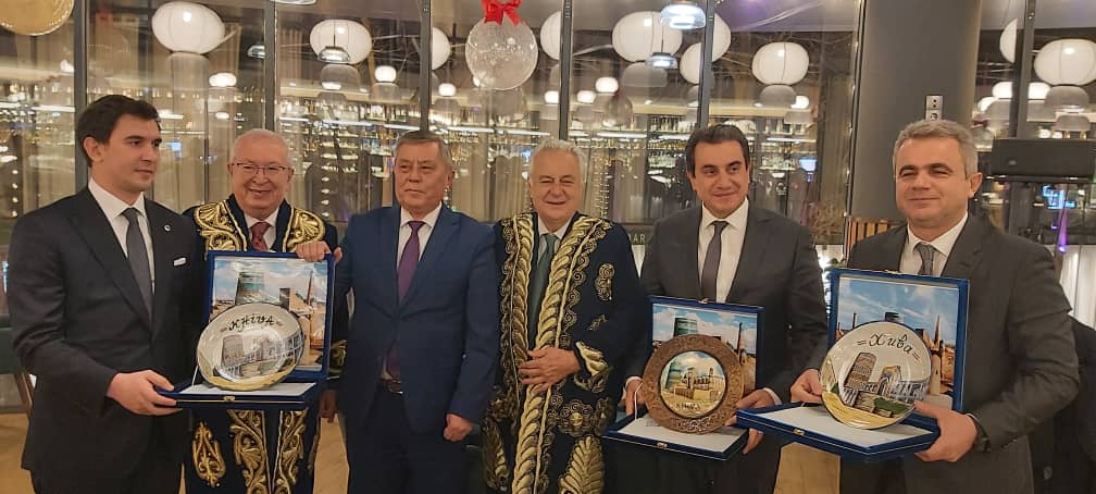 Umurzakov Bakhodir Khamadovich, the Minister of Labor of Uzbekistan, bestowed Dr. Akkan Suver and Cafer Okray with Chapans at the farewell dinner given on the last evening for the Marmara Group Foundation's Delegation consisting of Dr. Akkan Suver, Cafer Okray, Oğuzhan Ceylan, Bilal Bilici, Abuzet Sarı and Kazım Çelik. Umurzakov Bakhodir Khamadovich, Minister of Labor of Uzbekistan, hosted a farewell dinner at the last night of the Marmara Group Foundation Delegation in Uzbekistan. While various gifts were presented to the Delegation at the dinner, the Minister of Labor bestowed Dr. Akkan Suver and Cafer Okray with traditional Chapans.