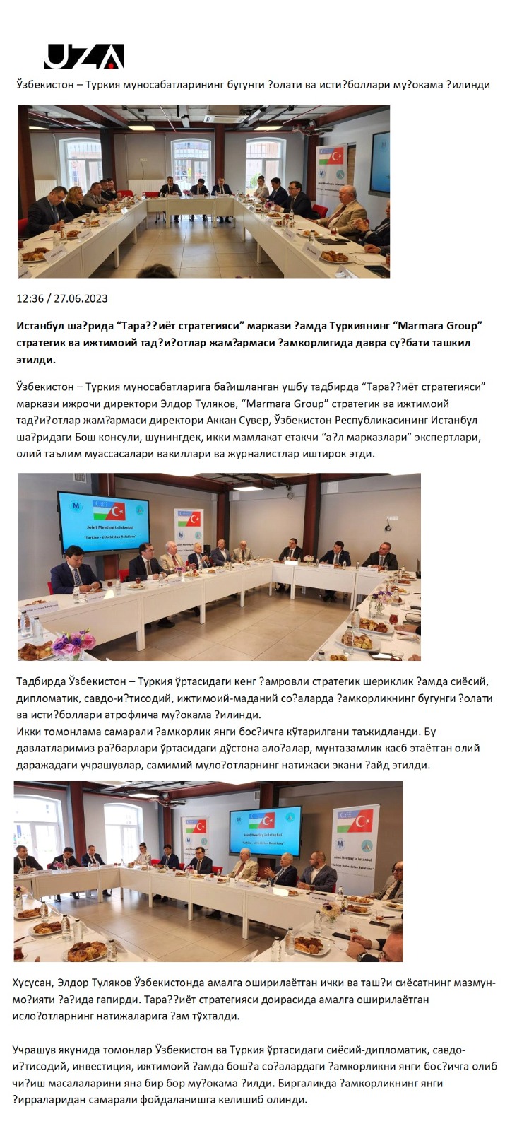 Marmara Grubu Vakfı’ndan Cafer Okray, Belgin Tanrıverdi, Hasan Yediyıldız, Av. Murat Keçeciler, Nimet Ulubay, Prof. Dr. Figen Yıldırım, Rahmi Dilek, Mustafa Ergin, Engin Köklüçınar, Abuzer Sarı, Murat Uçak ve Mahmut Saklı’nın katıldığı çalıştayda Özbekistan İstanbul Başkonsolosu Amirsaid Agzamkhodjayev de hazır bulundu.